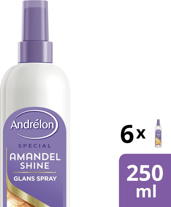 Deze heerlijk geurende lijn is verrijkt met een mix van amandelolie en honing. Honing staat bekend om haar hydraterende werking. Amandelolie bevat rijke voedingsstoffen en heeft de eigenschap diep in het haar door te dringen en glans te geven. Andrélon Amandel Shine is speciaal ontwikkeld om glans te geven aan dof haar. De glansspray, verrijkt met amandelolie en honing, zorgt ervoor dat de natuurlijke glans geactiveerd wordt. Je haar krijgt een schitterende glans en gaat stralen. De glansspray beschermt je haar tegen beschadigingen van je borstel of föhn en laat je haar weer glanzen. De glansspray maakt daarnaast je haar makkelijk doorkambaar zonder het te verzwaren. Resultaat: stralend gezond haar vol glans.
