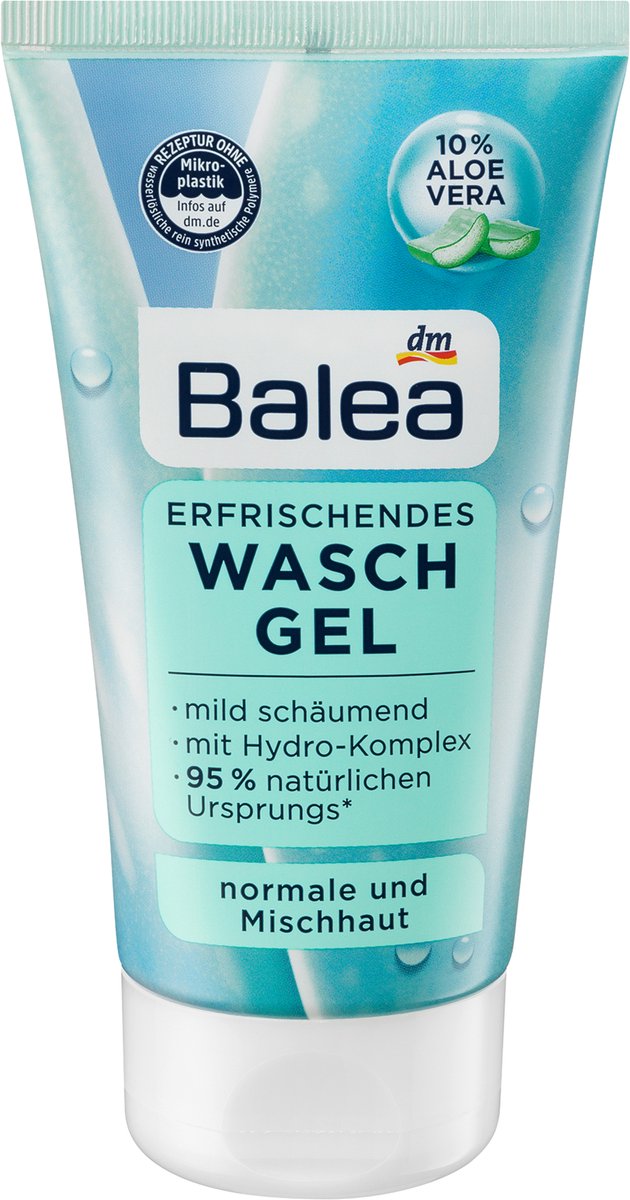 De verfrissende wasgel van Balea reinigt en vitaliseert de normale en gemengde huid als zachte voorbereiding op de verdere verzorging. De verfrissende wasgel met aloë vera heeft een mild schuimende formule - voor een grondige en zachte reiniging van de huid. De milde formule met plantaardige oppervlakteactieve stoffen verwijdert op milde wijze make-up, vuildeeltjes en huidafzettingen - ideaal voor gebruik op een glanzende teint. De formule met aloë vera en hydro-complex verheldert en verfrist de huid zonder haar uit te drogen. Formulering zonder microplastics en in water oplosbare zuiver synthetische polymeren.