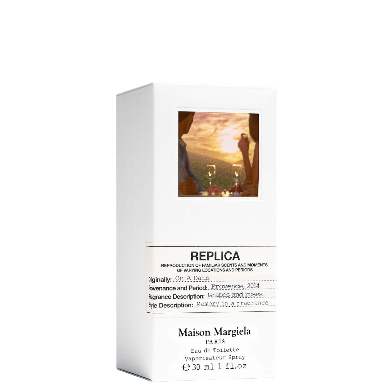 Maison Margiela - Replica On A Date Eau de ToiletteEen opwindend fris en zoet parfumOn A Date uit de Replica-lijn van Maison Margiela is een spannende geur geïnspireerd op een magische date op een eindeloze zomeravond, met uitzicht op de prachtige wijngaarden van de Provence bij zonsondergang.Dit parfum zet de zintuigen op scherp met diepgaande herinneringen aan dates, verleiding en verliefdheid door een unieke combinatie van een uitnodigende zwarte bessenlikeur, stralende roos, sprankelende bergamot en sensuele patchoeli.Ontdek On A DateGeurfamilie: Bloemige chypreTopnoten: Zwarte bessenlikeur, bergamot en roze peperHartnoten: Rozenbladeren, geranium en davanaBasisnoot: Patchoeli, vetiver en muskusBeleef het warme en sensuele karakter van het parfumGedrenkt in de gouden gloed van een nazomerse zonsondergangNoten van sprankelende bergamot en stralende roos zorgen voor een aantrekkelijke geur. Geniet van een pittige, heldere sprankeling dankzij de topnoot bergamot. Fruitigheid van rijpe druiven met een karakter van wilde rozen.Een herinnering aan warme, verliefde nazomeravondenOn A Date, het nieuwe parfum uit de serie Replica van Maison Margiela, vangt de sprankelende en verslavende fruitigheid van rijpe druiven gedrenkt in de warme zon en het delicate maar beslissende karakter van wilde rozen.Dit parfum zet de zintuigen op scherp met herinneringen aan dates en verliefde zomeravonden. Noten van sprankelende bergamot en lichtgevende roos brengen alle opwinding van een perfecte date over.Een uitnodigende, zoete zwarte bessenlikeur in combinatie met sensuele en houtachtige patchoeli voert ons naar de wijngaarden van de Provence. Een geur met duurzaam en ethisch gewonnen ingrediënten.Bij het werken aan dit parfum liet parfumeur Carlos Benaim zich inspireren door zijn eigen dierbare herinneringen aan de Provence, het toneel van zijn allereerste stappen in de parfumindustrie.Hij wilde in deze geur de zon van de Middellandse Zee vastleggen, die de wijngaarden verwarmt en die overloopt van heerlijke en vreugdevolle gevoelens van welzijn.