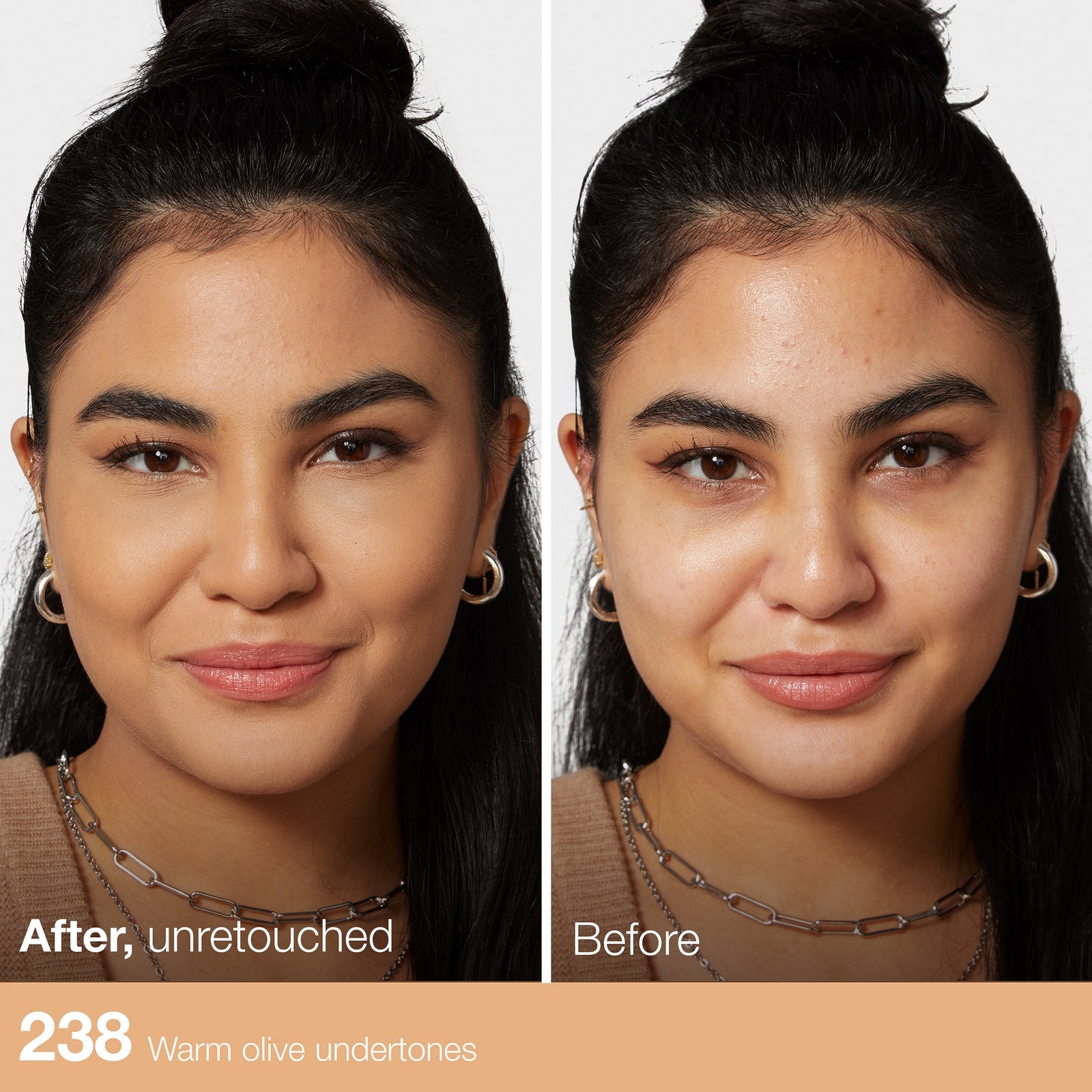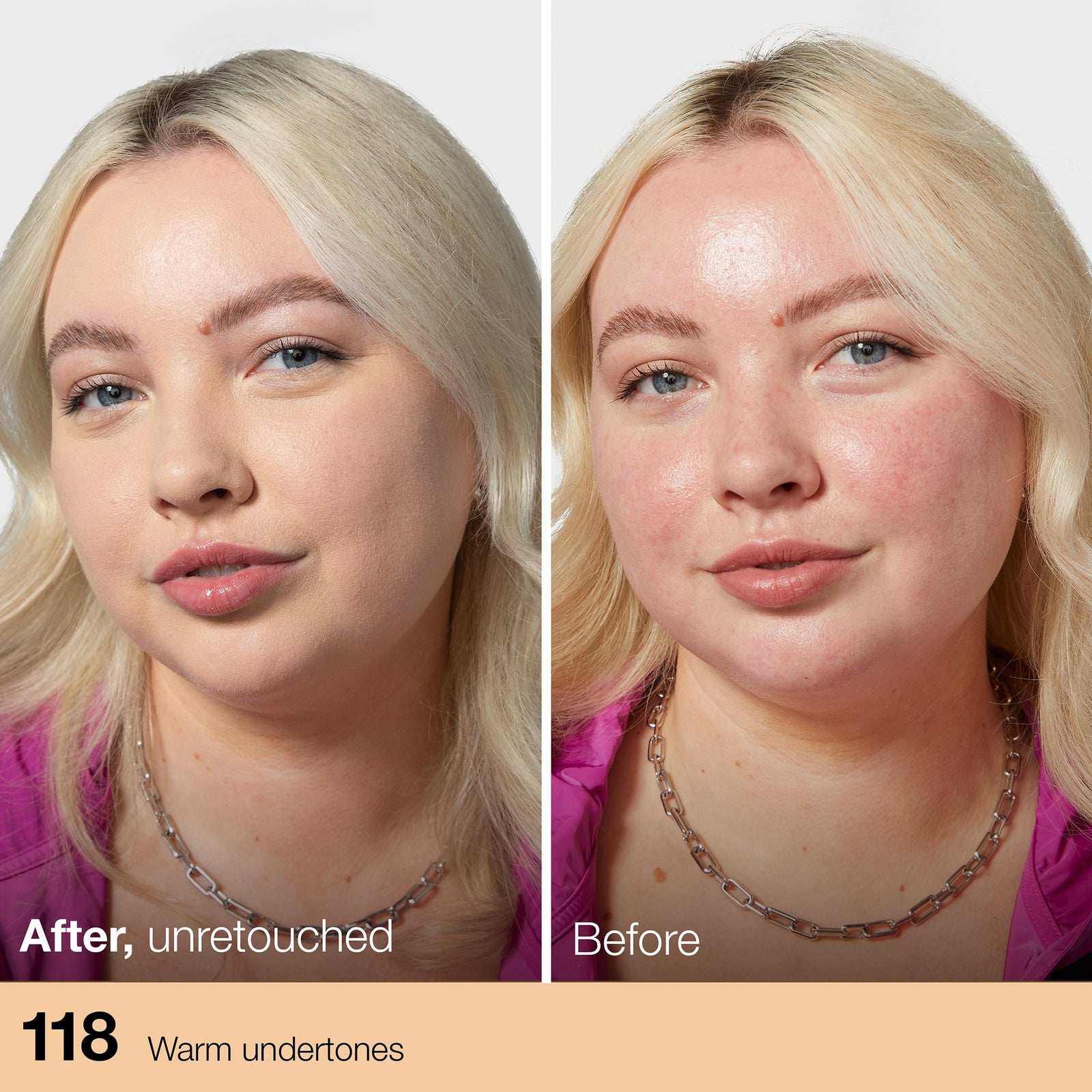 De ultra lichtgewicht formule bevat flexibele micro-poeders waardoor onwenselijke glans wordt tegengegaan en de poriën optisch kleiner lijken gedurende de dag.Zo krijg je tot 12 uur lang een natuurlijke en egale dekking van oneffenheden en imperfecties met Fit Me Matte & Poreless 124 Soft Sand.De matterende foundation is uitermate geschikt voor normale tot vette huidtypes. Met de medium dekking van de olievrije matterende foundation krijg je een natuurlijk resultaat zonder dat je je geen zorgen hoeft te maken over een maskereffect.Vind nu jouw unieke fit!De matterende foundation is beschikbaar in 40 kleuren van Classic Ivory tot Deep Golden zodat jij kan ontdekken welke foundationkleur het best aansluit bij jouw unieke behoefte. Dermatologisch getest - op allergieën getest - non-comedogeen.