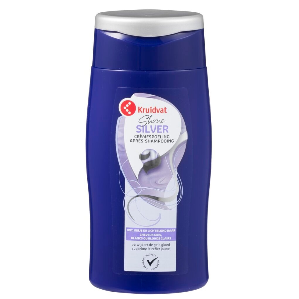 Deze Kruidvat Shine Silver Crèmespoeling verwijdert de gele gloed van wit, grijs en lichtblond (gekleurd) haar. De kleurcorrigerende formule bevat paarse pigmenten die de gele gloed neutraliseren voor een frisse kleur.