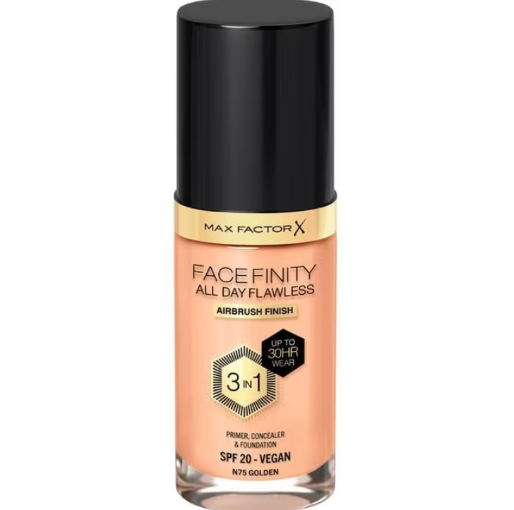 Max Factor Facefinity All Day Flawless Foundation staat garant voor een feilloze make-uplook en is nu bestand tegen alle weersomstandigheden. Deze 3-in-1 vloeibare foundation doet tegelijk ook dienst als gezichtsprimer en heeft het effect van een concealer die de hele dag mooi blijft zitten. De vederlichte, zuurstofdoorlatende vegan formule maakt poriën en roodheid minder zichtbaar en camoufleert oneffenheden. Niet alleen zorgt de formule voor een perfect egale finish, maar deze foundation is ook bestand tegen de weersomstandigheden en verrijkt met SPF20 om de huid te beschermen tegen uv A- en uv B-stralen, blauw licht en vervuiling.