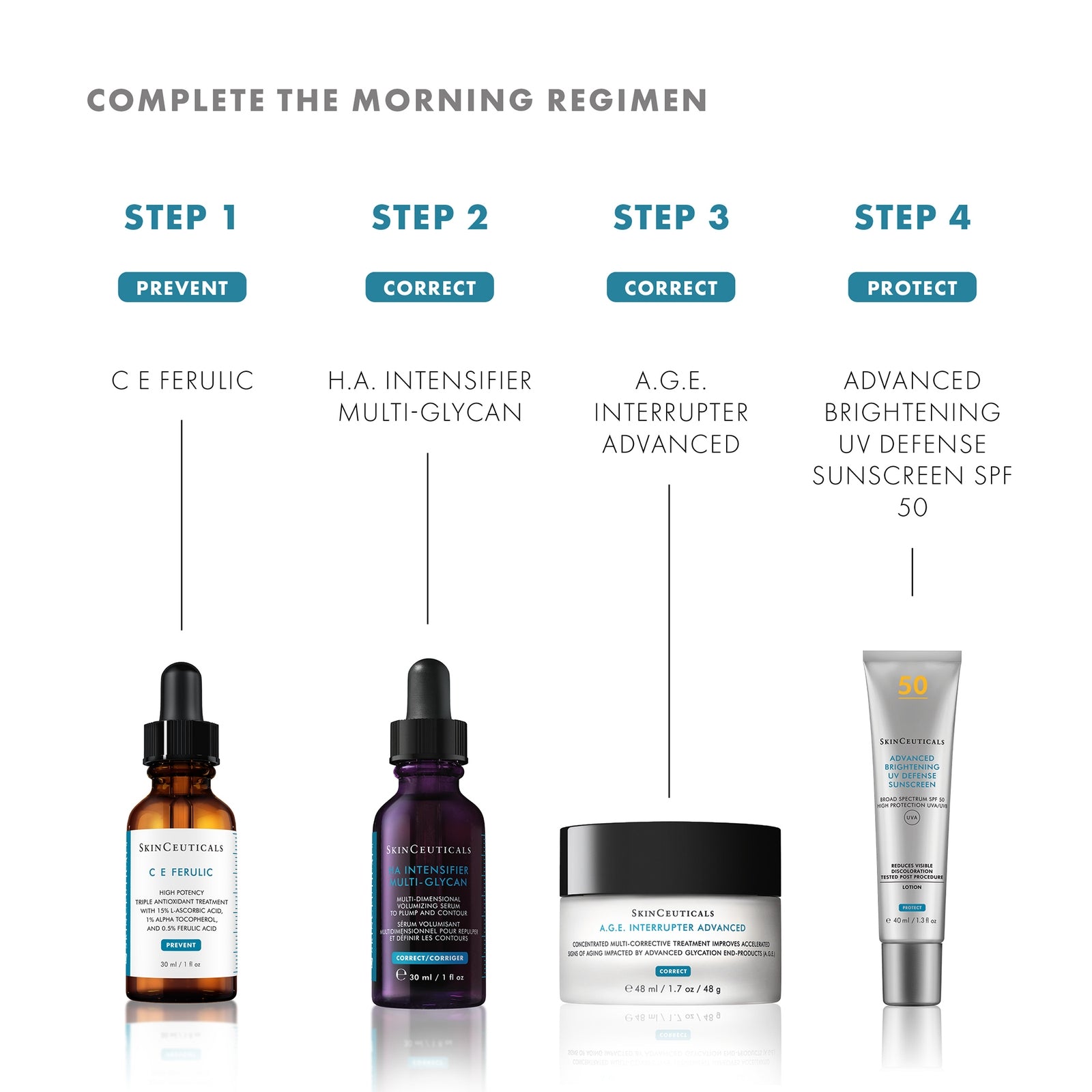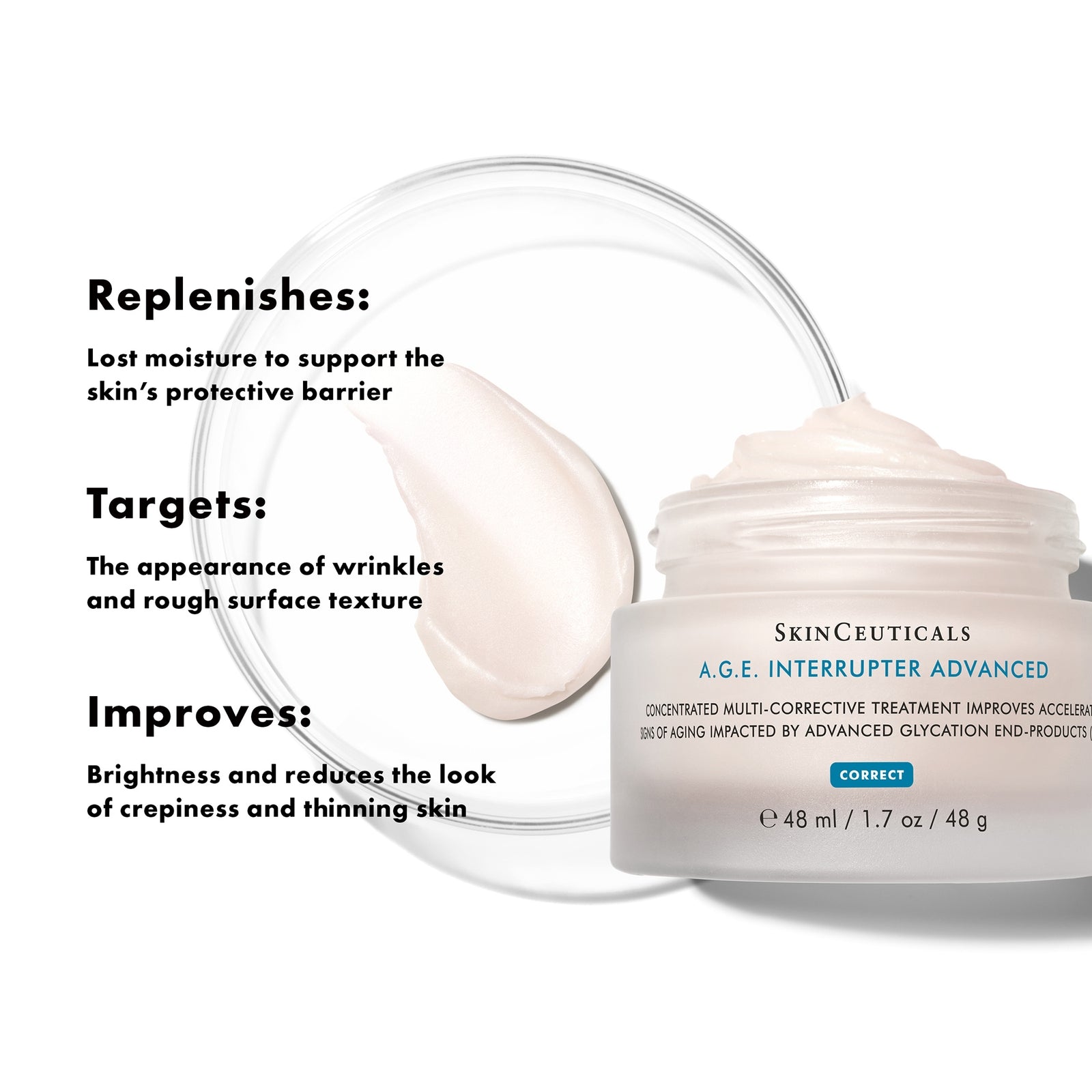 Helping to visibly firm and smooth the skin, the SkinCeuticals A.G.E. Interrupter Advanced Cream is an innovative formula ideal for mature skin types. Featuring 30% Proxylane™, the cream encourages the look of elasticity, seeking to plump the skin texture with moisture to diminish the appearance of fine lines. Fortified with 4% blueberry extract to provide antioxidant benefits, the hydrating formula helps to protect the complexion against urban pollutants, while 0.2% phytosphingosine promotes a stronger-looking skin barrier. Applied daily, the skin appears more supple and renewed over time.