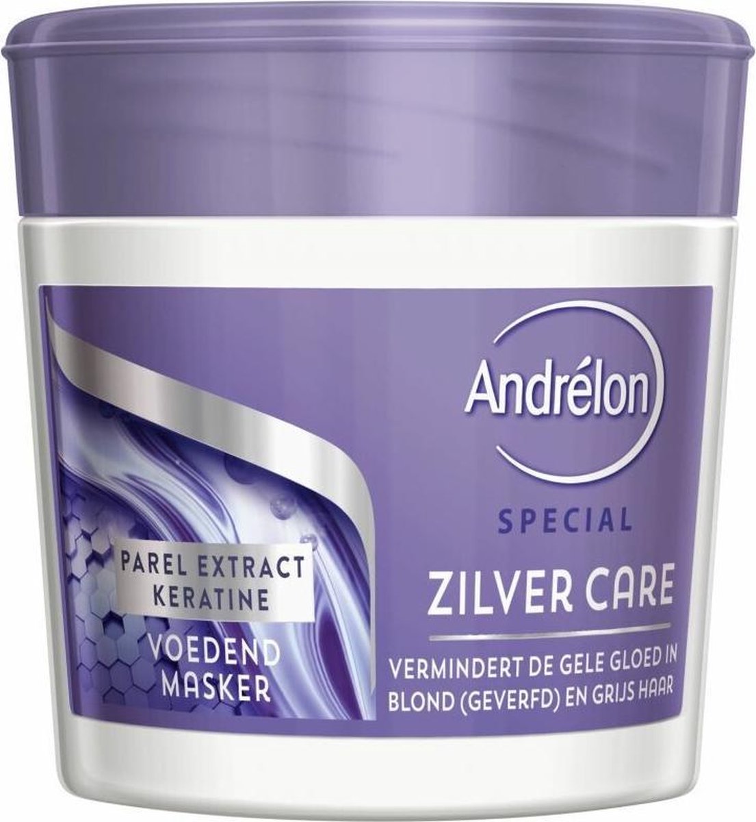 Dit Andrelon Haarmasker Zilver Care vermindert de gele gloed in je haar. Haartypes zoals blond (geverfd), grijs en wit haar hebben de neiging een gelige kleur te krijgen. Het haarmasker heeft een lichte blauw-paarse kleur die de gele gloed in blond (geverfd), grijs of wit haar neutraliseert, wanneer je deze in combinatie met de shampoo gebruikt. Het masker voedt je haar en zorgt ervoor dat de natuurlijke glans wordt geactiveerd. Zo krijg je je mooie en natuurlijk frisse kleur terug, wordt je haar verzorgd en ziet het er gezond glanzend uit.