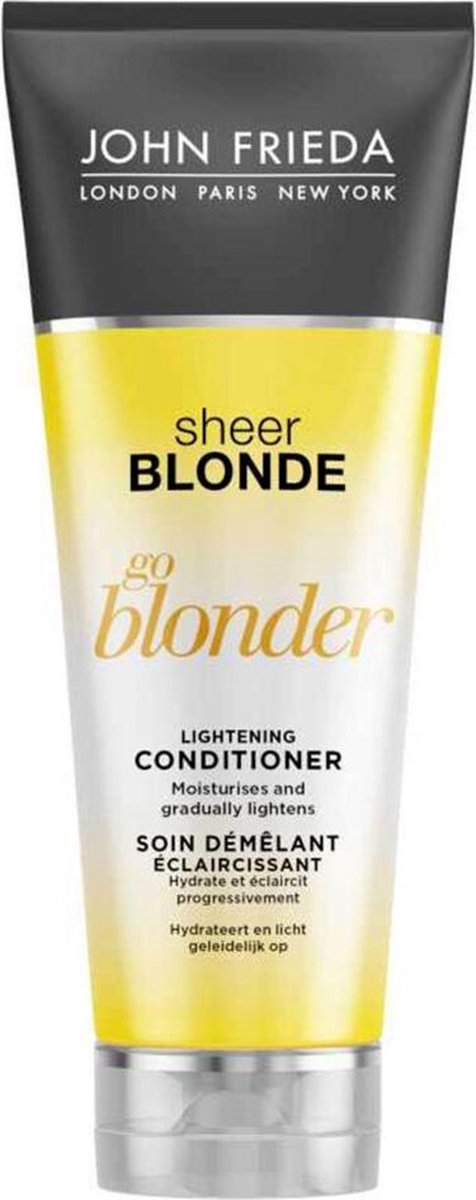 John Frieda Go Blonder Shampoo licht blond haar geleidelijk op en is mild genoeg voor dagelijks gebruik. De formule met een natuurlijk lichtmakend complex, vermindert lichtjes de kleurpigmenten in het haar. Deze Go Blonder bevat geen ammoniak of peroxide en is geschikt voor alle nuances van natuurlijk, gekleurd of gehighlight blond haar. Je kan de blonder het hele jaar door gebruiken.