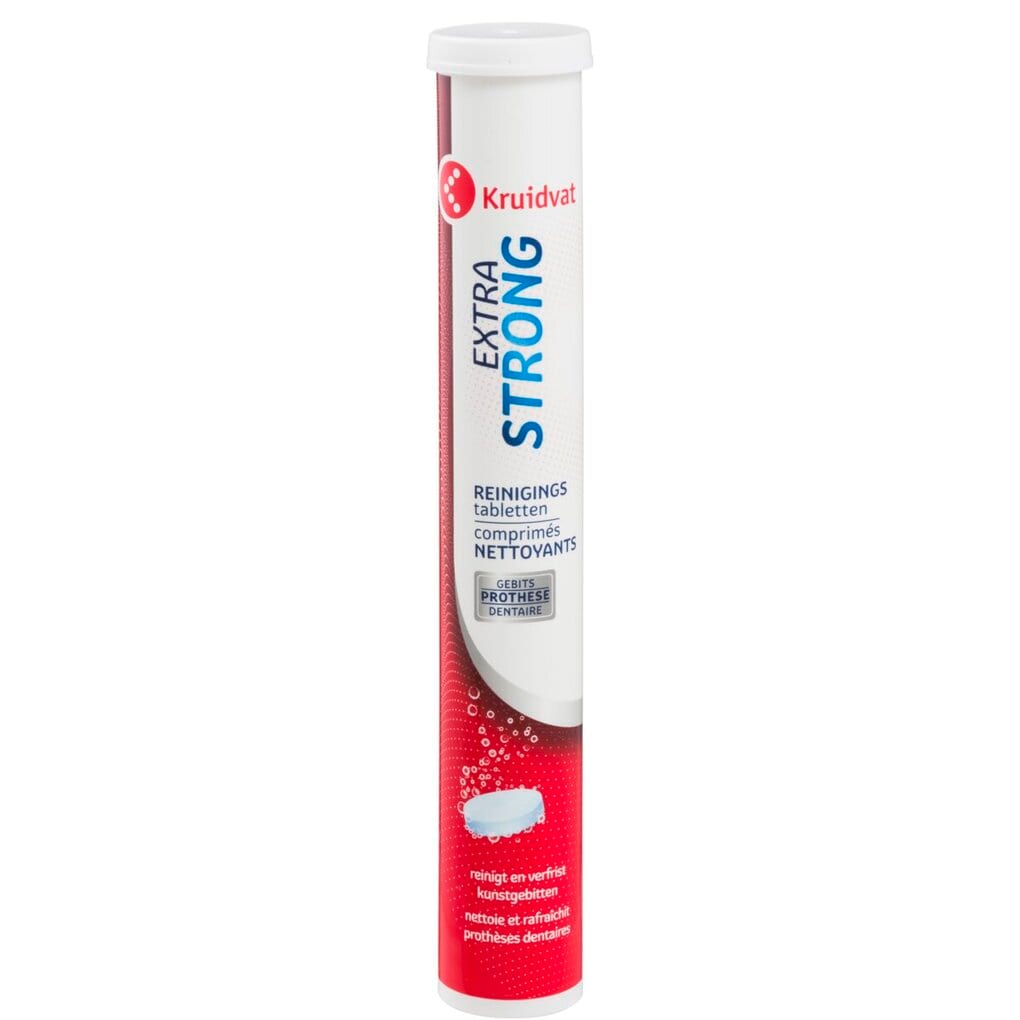 Reinig en verfris je kunstgebit en gebitprothese intensief binnen 3 minuten met de Kruidvat Extra Strong Reinigingstabletten. De unieke anti-tandsteen formule met actieve zuurstof reinigt je gebit zeer grondig.